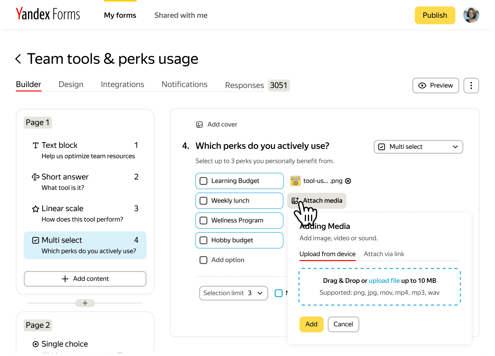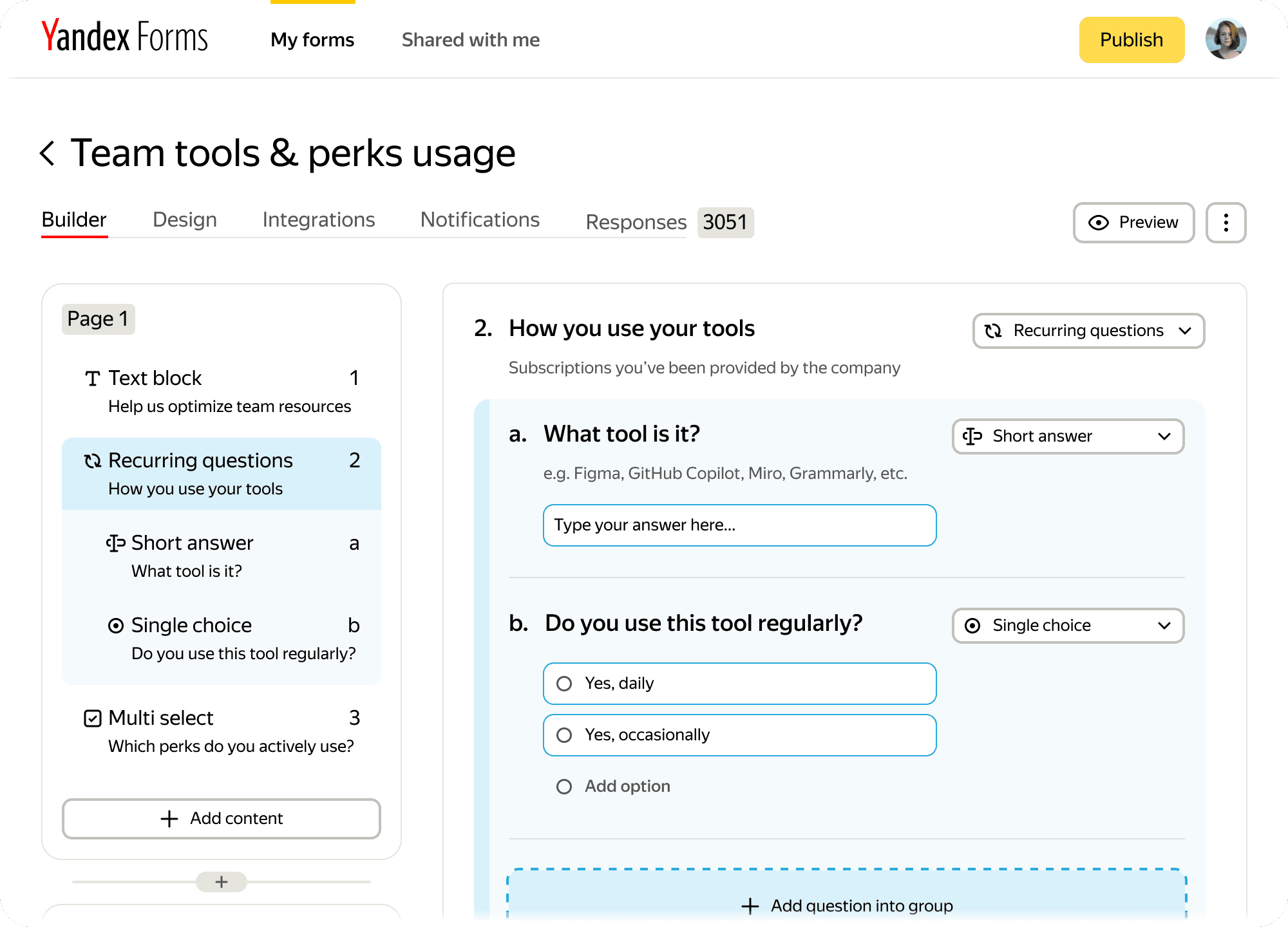 Yandex Forms is a B2B survey platform—think Google Forms, but shaped for business. When I joined, it was transitioning from an internal tool to a default service in the Yandex 360 suite, reaching thousands of mid-sized and enterprise customers. Yet, adoption was lagging: users needed more than a basic builder—they needed flexible, branded forms that fit real workflows like employee feedback or partner compliance.