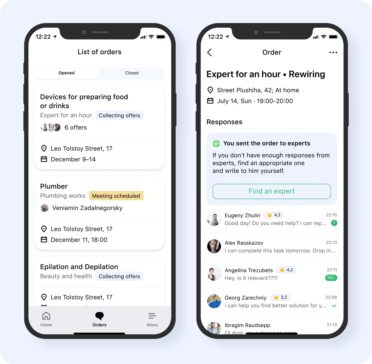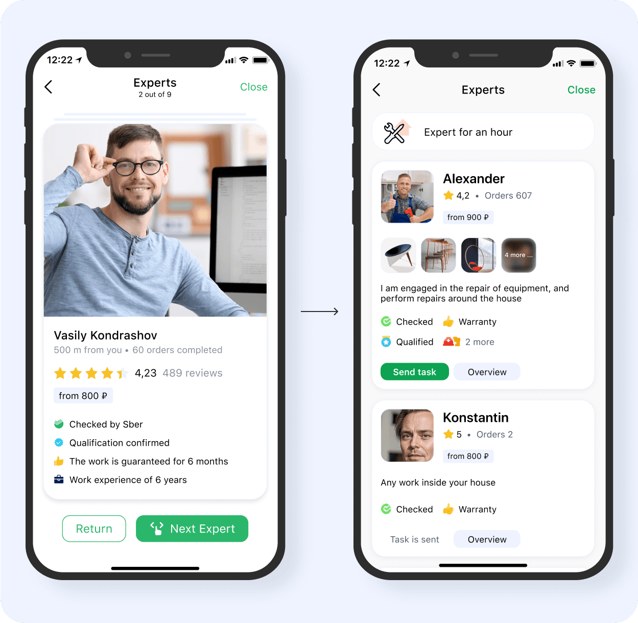 When customers search for an expert, they need a quick way to compare and choose the most reliable one. I prioritized trust signals — ratings, reviews, relevance — to support fast, confident decisions. Expert response time cut to 15 min (from 1.2h) and 2.3× more contacts as a result.